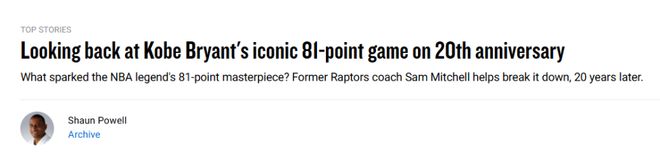 北京时间1月23日,20年前的今天,科比-布莱恩特在对阵猛龙的比赛中轰下81分。NBA官网撰写长文致敬这一神迹,并采访了当时科比这场比赛的对手主帅萨姆-米切尔。他从对手的角度回顾了这一场经典之战,以下是官网全文——