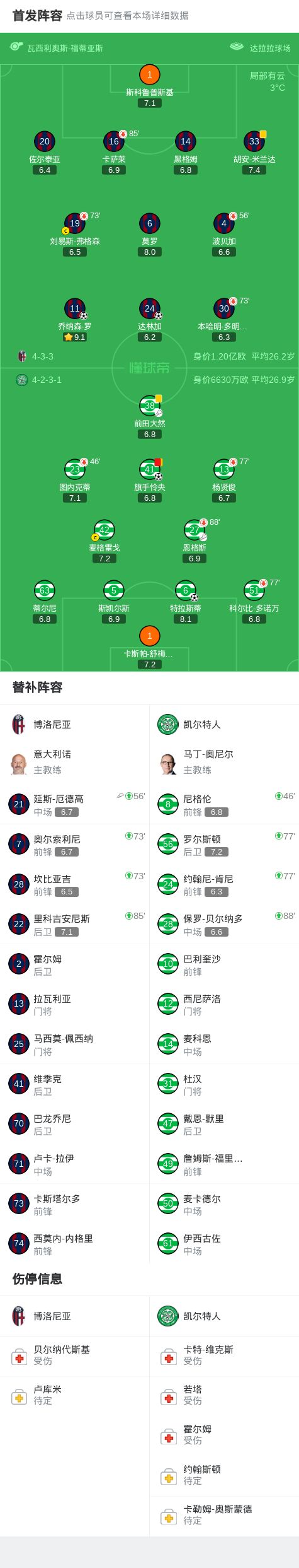 北京时间1月23日欧足联欧洲联赛 联赛阶段 第7轮,博洛尼亚对阵凯尔特人。博洛尼亚达林加破门,乔纳森-罗破门。凯尔特人旗手怜央破门,特拉斯蒂破门。最终比分博洛尼亚 2-2 凯尔特人。